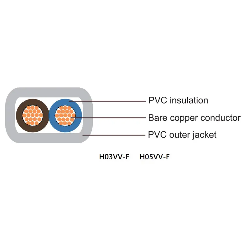 H05VV-F, H05VVH2-F, H03VV-F, H03VVH2-F è composto da conduttori in rame fine di Classe 5, isolamento e guaina in PVC senza piombo.